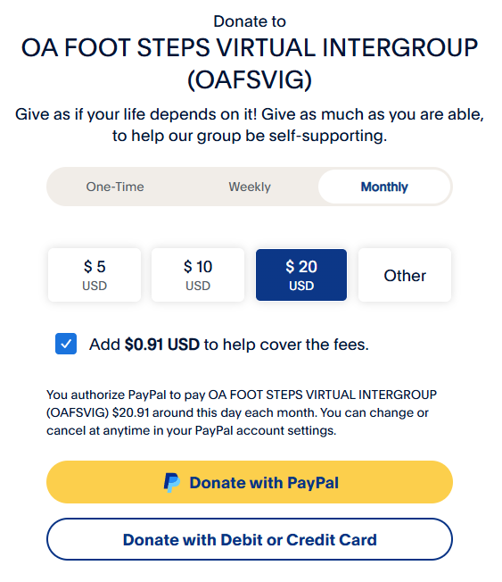 Give as if your life depends on it! We encourage OA members to give as much as they are able, to help our group be self-supporting. While the suggested contribution is US$5.00 per meeting or more, we welcome contributions of any amount. PayPal charges a set fee for each donation, so larger donations go farther.